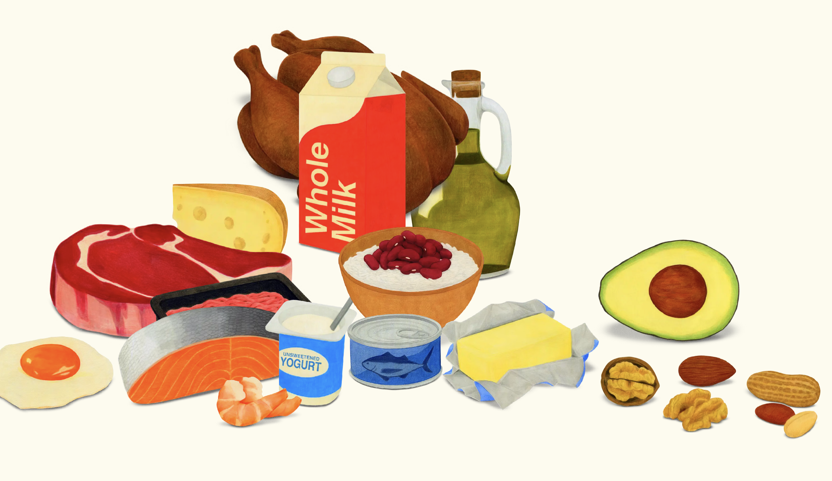 Every meal should prioritize high-quality protein paired with healthy fats from whole foods: eggs, seafood, meats, full-fat dairy, nuts, seeds, and avocados.